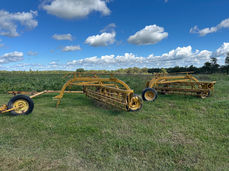 Case IH 3440 Round Baler; Case IH 1190 9’ Haybine; Gruetz 9’x18’ Bale Cage, Treated Floor w/Running Gear; New Holland 56 10’ Rake w/Dolly Wheels; New Holland 56 10’ Rake w/Jack; Pull Type Implement Rake Puller.